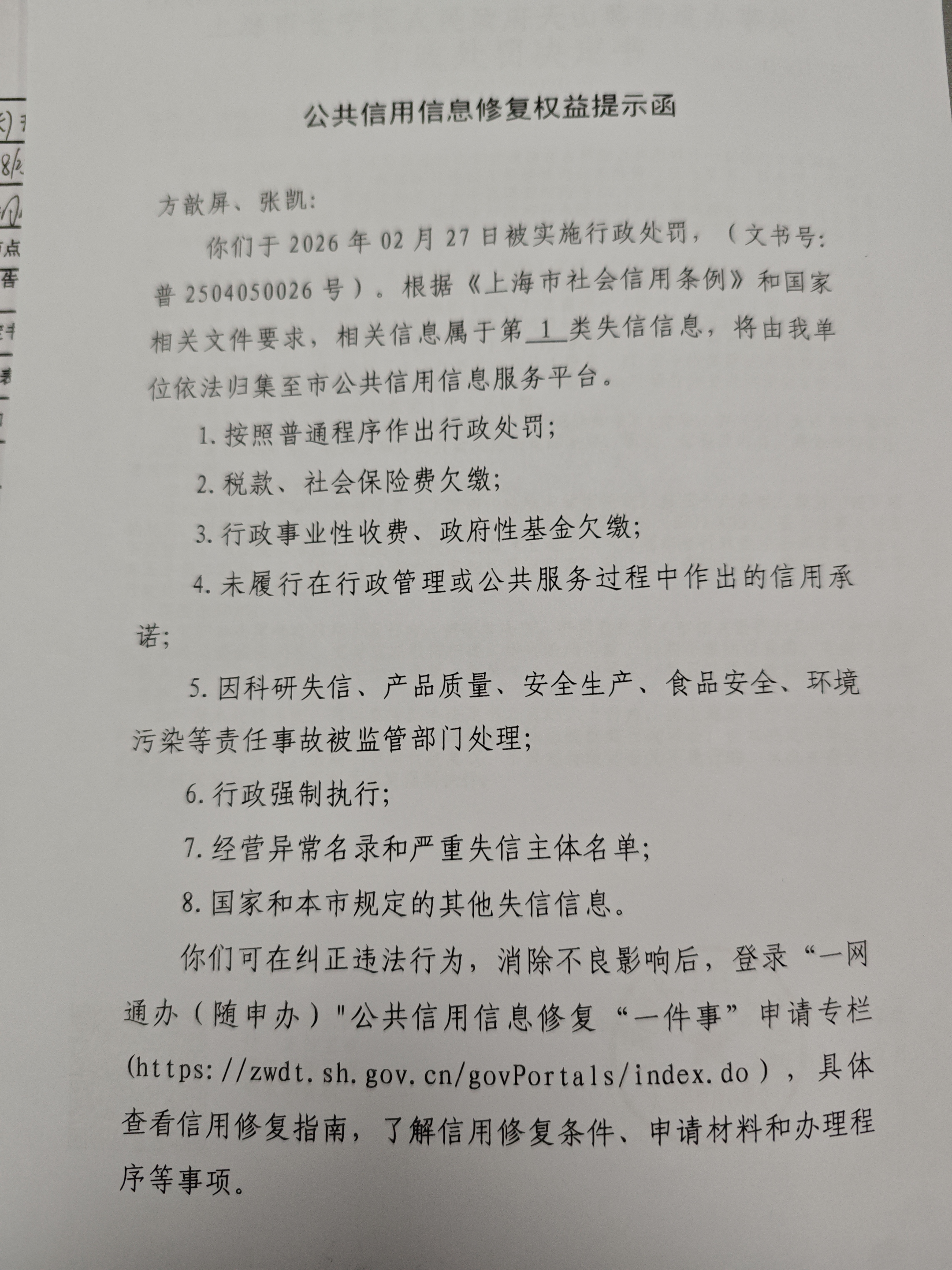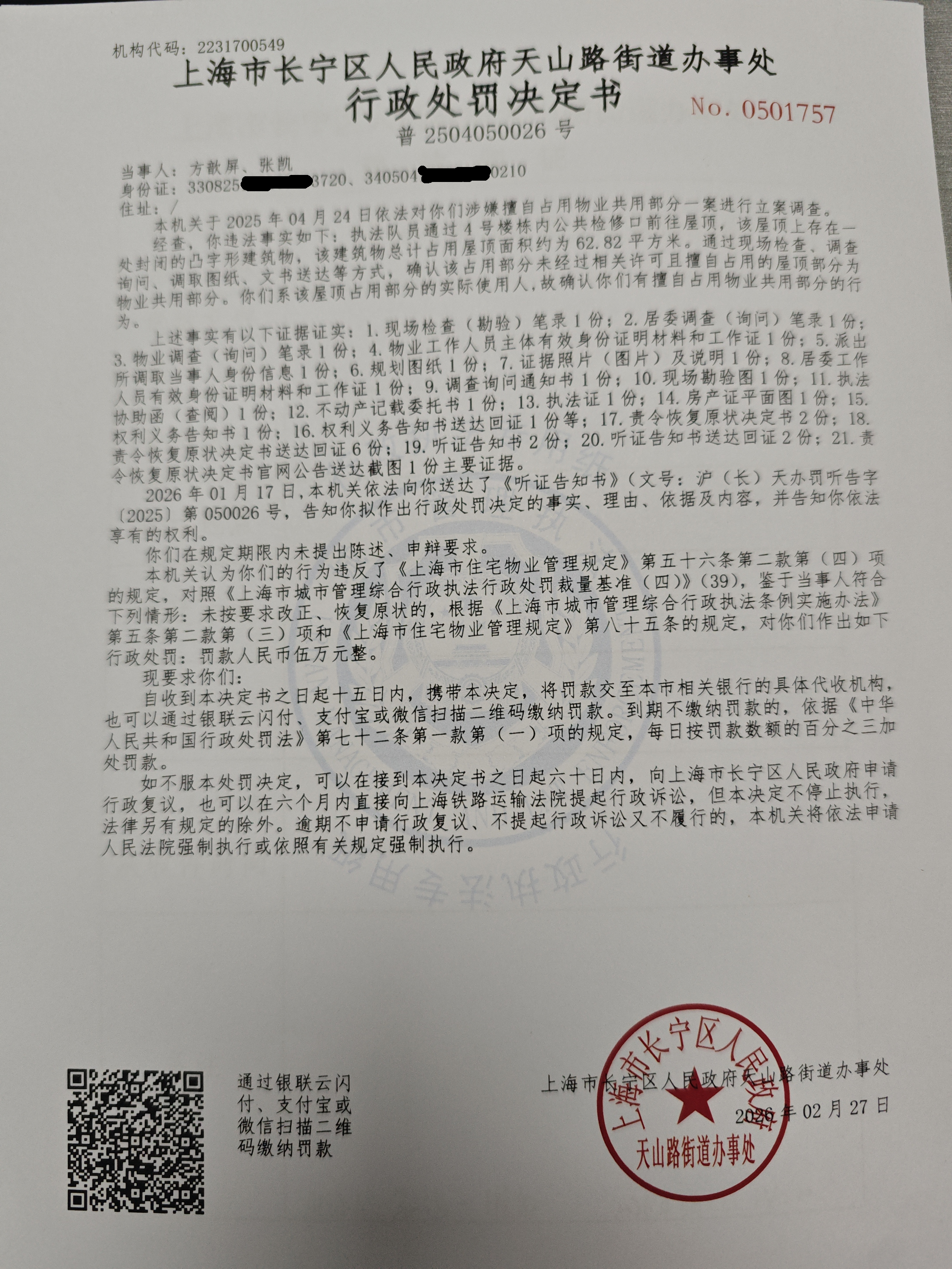 我单位于2026年2月27日作出玉屏南路110弄4号703室楼顶擅自占用物业共用部分一案的《行政处罚决定书》(普2504050026号),因直接送达、邮寄送达未果,我单位依法向你公告送达。
