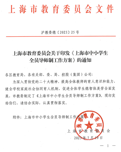 现将《上海市教育委员会关于印发〈上海市中小学生全员导师制工作方案〉的通知》(沪教委德〔2023〕25号)转发给你们。请各学校结合实际,在原有工作基础上进一步完善实施方案,提升工作质量,覆盖全体学生。现代职校参照执行。