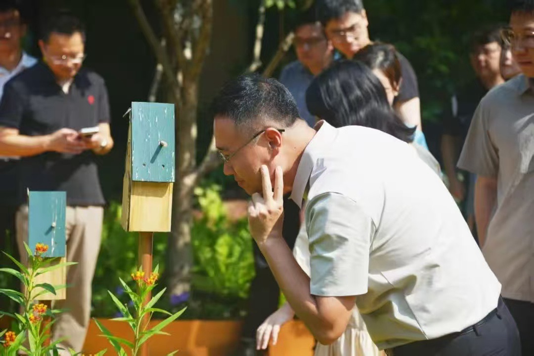 “这里不只是花园,更是昆虫和鸟类的‘中途休息站’。”设计师介绍道,花园按日照分区打造,从蜜源植物提供的“全年自助餐”,到蝶饮台的“矿物吧”,再到育蝶园里为幼虫准备的“定制餐”,处处体现对生物多样性的细致考量。大家驻足草坪,看着这座精心打造的花园,纷纷感叹,“在商务园区里能邂逅这样的自然之美,太惊喜了”。